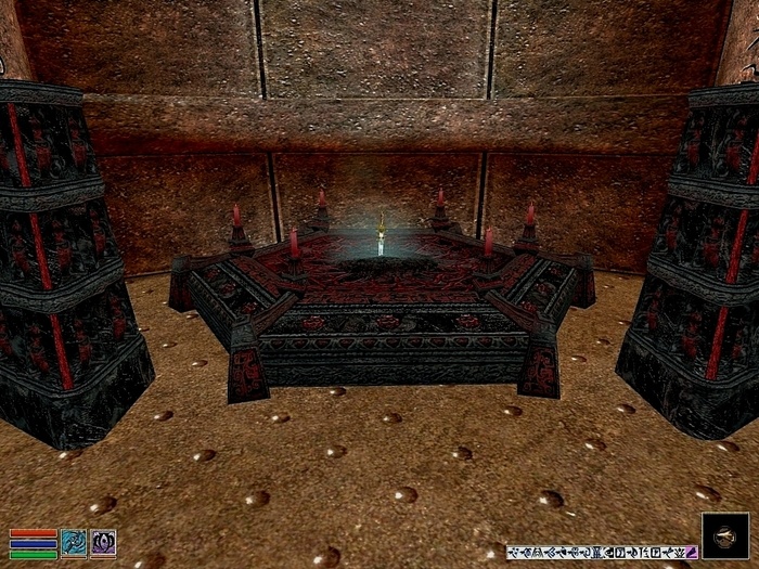 Кастуем Возврат и оказываемся в Кальдере перед доверенным торговцем. Сдаем ненужное и через проводника гильдии Магов телепортируется в Балмору. Засовываем артефакты в свое хранилище и бежим в ближний храм восстанавливать у алтаря характеристики, пониженные пепельными монстрами. Практически каждый поход на Красную гору заканчивается этим.