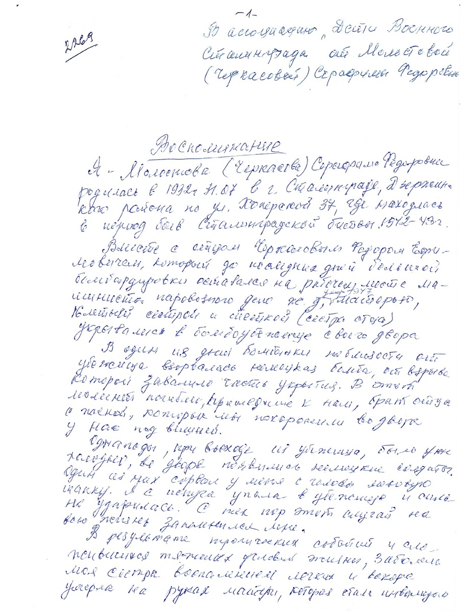Воспоминания Молостовой (Черкасовой) Серафимы Федоровны