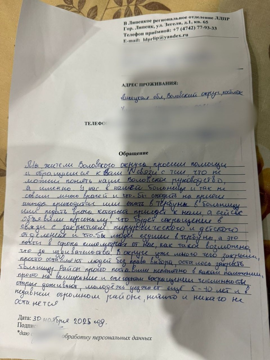 "Хирургическое и детское отделение закрывают, придется ездить в Тербуны ", - получил тревожное обращение из Воловского округа