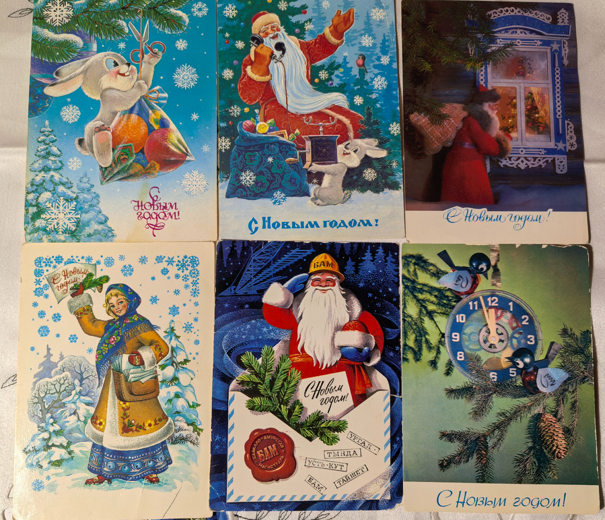 Старинные Новогодние открытки времён СССР. Добрые, немного наивные, веют теплотой. Их рисовали многие известные советские художники: В. Зарубин, К. Андрианов, Г Куприянов, В. Четвериков, Л. Алисова, Т. Ожегова, А. Жребин и др. Они издавались миллионными тиражами. Но до сегоднишних дней дошли не все. И теперь являются напоминанием о старине, атмосфере Нового Года в былые времена, а кому-то воспоминанием о прошлом советском времени. Пролистайте галерею ниже. Первые две открытки в верхнем ряду конечно же В. Зарубина 1981 и 1984 годы. Эти открытки вошли в историю, отмечены в катологах. Третья Г. Куприянова 1987 года. В нижнем ряду первая (девушка машетписьмом "С Новым годом") также известная открытка художника С Комарова. Платок, шубка и сарафан у девушки нарядные, с народным рисунком. Собратной стороны открытки напечатана марка - композиция Рабочий и Колхозница с серпом и молотом, надпись "почта СССР". Дальше Дед Мороз в каске с надписью БАМ, художник Г. Комлев 1977 год. Я помню времена,