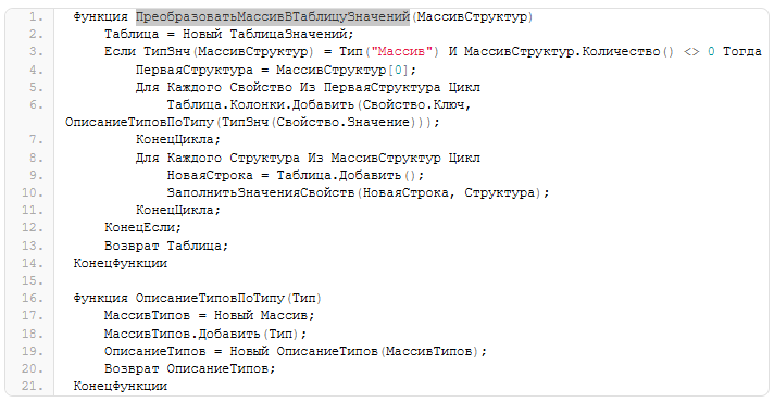 Функция преобразует таблицу значений в массив структур. Может использоваться для передачи на клиент данных в том случае, если таблица значений содержит только такие значения, которые могут быть переданы с сервера на клиент. Полученный массив содержит структуры, каждая из которых повторяет структуру колонок таблицы значений. Не рекомендуется использовать для преобразования таблиц значений с большим количеством строк. Функция расположена в общем модуле "ОбщегоНазначения" и называется "ТаблицаЗначенийВМассив".