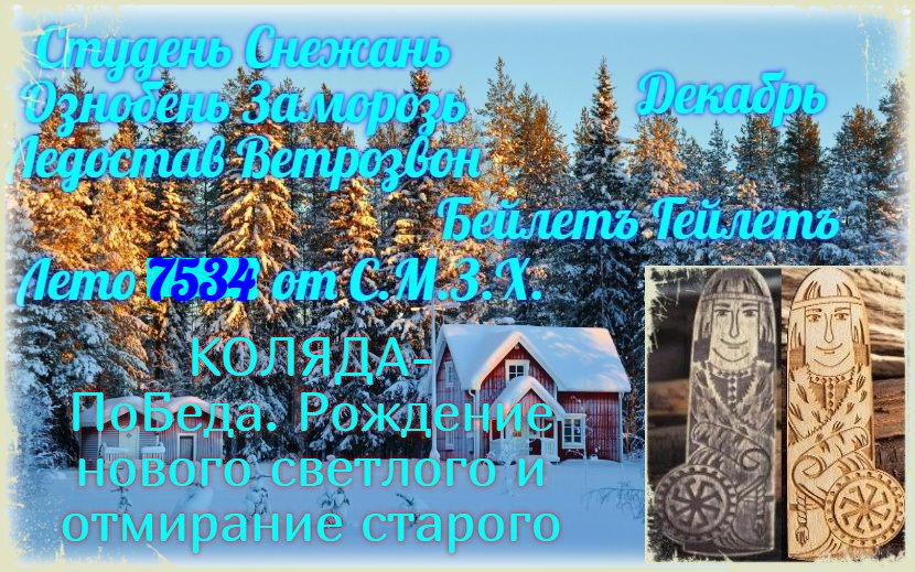 Славянские праздники в декабре 7534 Лето от С.М.З.Х. 1 декабря — Выргонь. 3 декабря - День Светогора. C 4 по 6 декабря - Почитание Зари,Леденье,Cтановление зимней погоды. 6 декабря - День Мороза, Духа Зимы. Сам Велес приходит в образе Мороза.