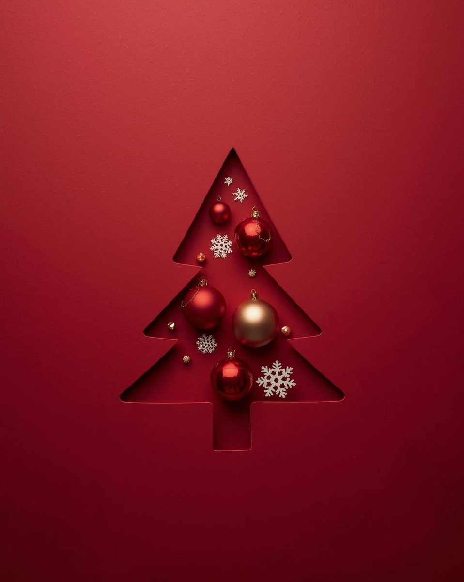 Реалистичное изображение с глубоким красным фоном, на котором размещён минималистичный силуэт рождественской ёлки, вырезанный по контуру
