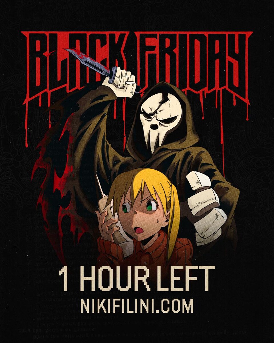 На постере мем: сверху типа образ беспощадного времени, а снизу распродажа BLACK FRIDAY в NIKIFILINI Как бы мы не хотели сбежать от этого — время всех догонит. Всего 1 час остался до конца BLACK FRIDAY