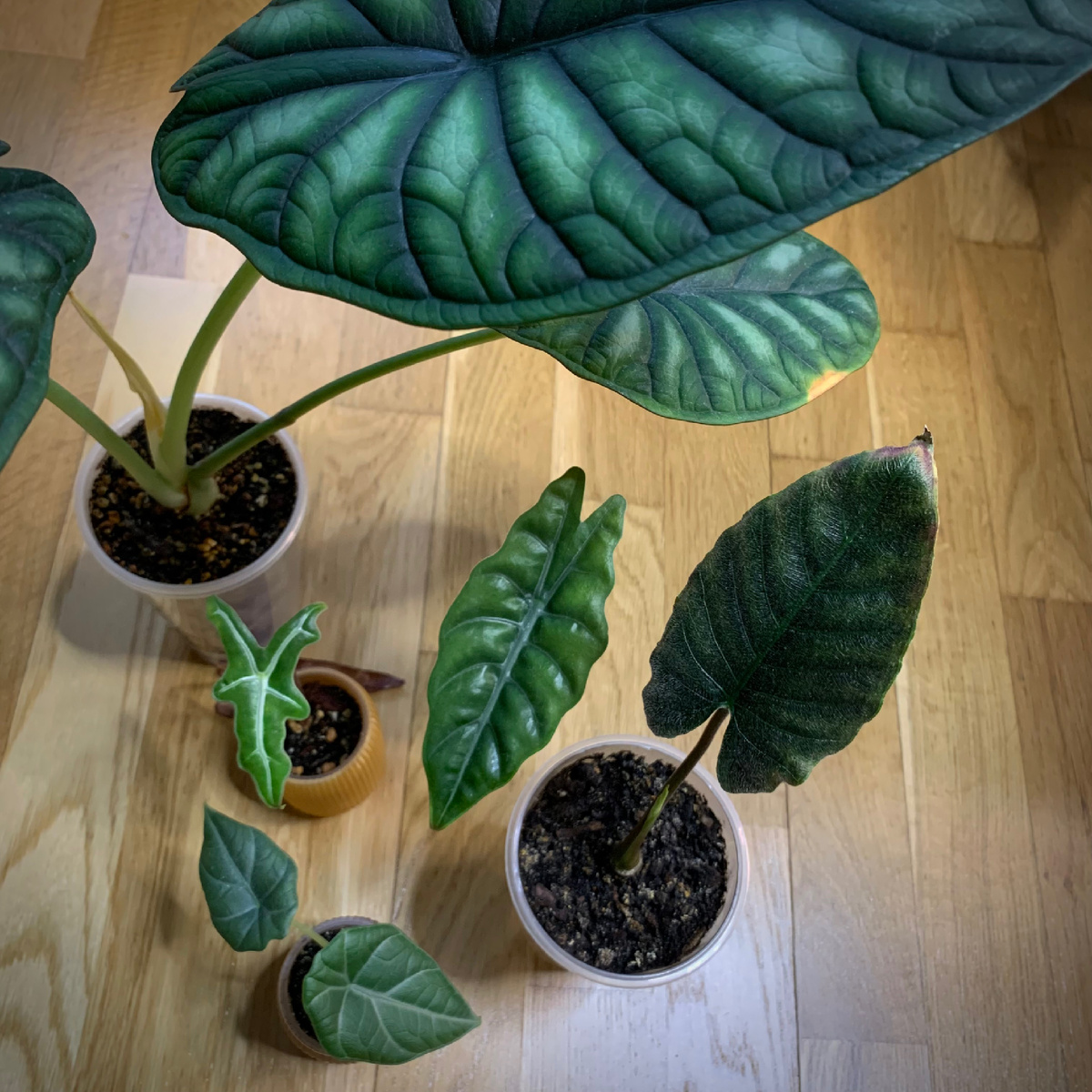 Как бы ни хотелось говорить «у меня такого нет», но это было бы неправдой. У меня тоже есть алоказии, которые сейчас держат один лист, два листа, максимум три. И это не какие-то «слабые» растения или случайные экземпляры — это те же самые алоказии, просто в определённом этапе своего состояния.