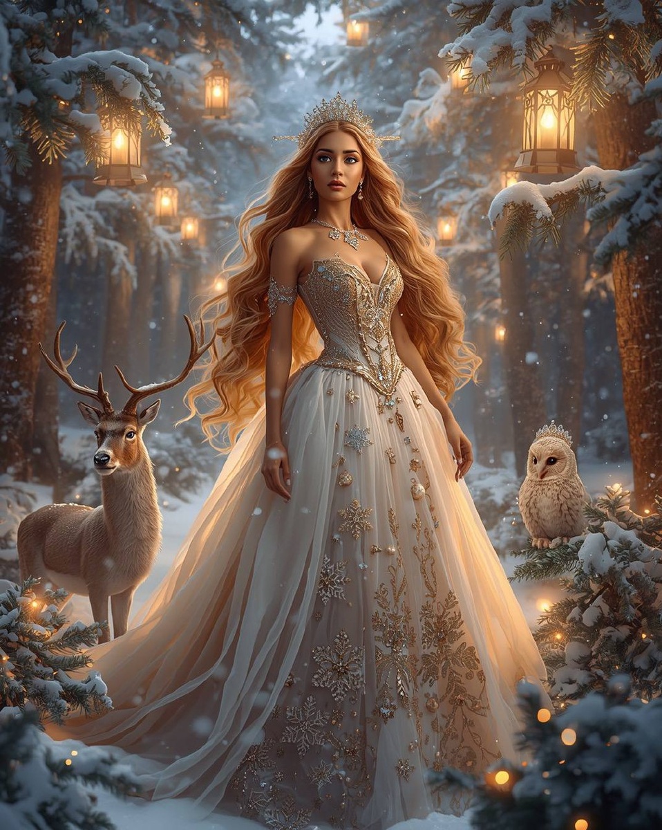 Промт - a surreal and vibrant cinematic photo of a breathtaking fantasy Christmas princess with radiant morena skin, medium shot, standing in an enchanted winter forest filled with sparkling pine trees covered in soft, powdery snow, their branches etched with frost. Her long, flowing caramel hair cascades in golden-highlighted waves, glowing under warm, magical lanterns that cast a soft, ethereal light. Her eyes are ultra-realistic, natural, and expressive, with lifelike emotional depth, shining in hues of honey, soft gray, or green. She wears an exquisite, floor-length gown in Vanilla Cream, Light Mocha, and Caramel Beige, decorated with intricate winter embroidery, shimmering accents, and delicate crystal threads that catch the light. Surrounding her are magical Christmas animals, including a gentle white deer with glowing antlers, fluffy winter rabbits, and a shimmering snowy owl perched on a frosted branch, as snowflakes drift like glowing stars and warm holiday lights illuminate t