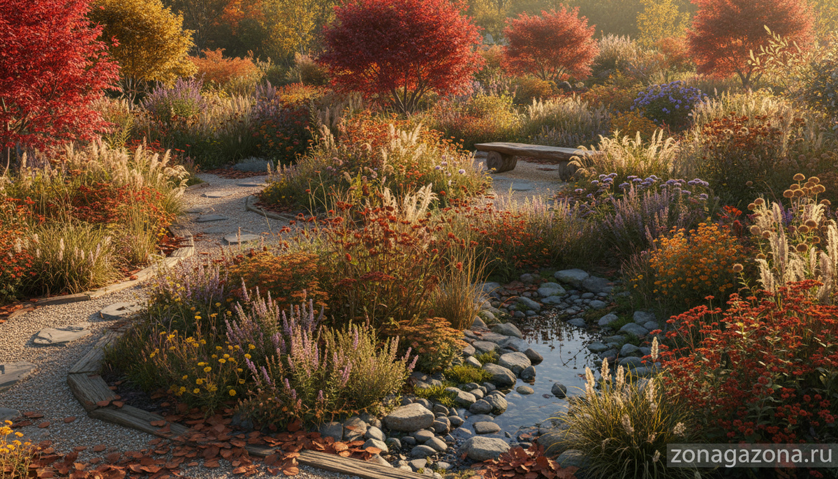 - Автономность — многолетники и злаки требуют минимального вмешательства.