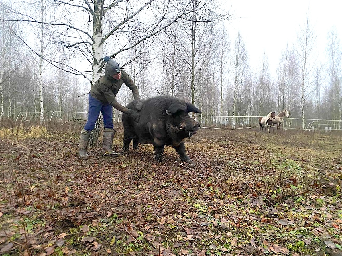 Вас часто будят предложением кусочка пирога с утра или да еще и с последующим массажем? Подозреваю, что не очень, хотя, думаю, некоторые не отказались бы от такого утра. А у нас в Святополе есть один «экземпляр», чьи утра иногда проходят подобным образом. И это не Ника, не Ваня и даже не я (хотя от ежедневного массажа после подъема я бы точно не отказалась). Это Сэр Бэкон. Как-то сама собой за осень у Вани сложилась традиция угощать кабанчика по утрам чем-то вкусненьким. И не просто угощать, а именно желать доброго утра с таким вот «подношением». То кусочек домашнего тортика ему принесет, то пирожок, то бутерброд какой-нибудь вкусный… Сэр Бэкон, конечно, очень довольным теперь просыпается. То есть у кабанчика и до этого по утрам было хорошее настроение, а теперь он порой прямо выбегает из своего загончика погулять, когда мы его открываем. Такая традиция сложилась сама собой: что-то упало, что-то вовремя не доелось, что-то несанкционированно понадкусали кошки (как Тортина на днях умудр