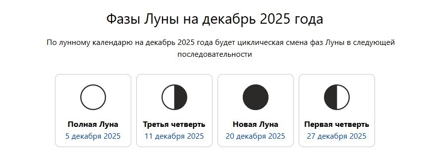 Лунные календари на декабрь 2025 года: Узнайте, какие дни будут благоприятными для разных дел в декабре! � 🌗 Лунный календарь на декабрь 2025 года — Полезная информация о фазах Луны и их влиянии на вашу повседневную жизнь: Подробнее � ✂ Лунный календарь стрижек на декабрь 2025 года — Когда лучше стричь волосы для здоровья и красоты? Подробнее � 🌱 Лунный календарь огородника и садовода на декабрь 2025 года — Благоприятные дни для посевов, посадок и других садовых работ! Подробнее � 📅 Лунный календарь дел на декабрь 2025 года — Удачные дни для решения важных задач и начинаний. Подробнее � 💍 Лунный календарь свадеб на декабрь 2025 года — Выберите день для вашего идеального торжества. Подробнее