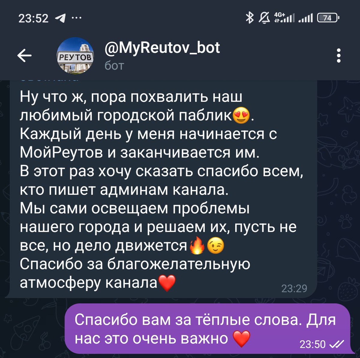 💛 Ну что ж, пора похвалить наш любимый городской паблик😍. Каждый день у меня начинается с «Мой Реутов» и заканчивается им. В этот раз хочу сказать спасибо всем, кто пишет админам канала. Мы сами освещаем проблемы нашего города и решаем их, пусть не все, но дело движется🔥😉 Спасибо за благожелательную атмосферу канала. #отподписчиков Друзья, спасибо за ваши отзывы и за то, что помогаете освещать жизнь нашего города! 🤩 Подписаться | Прислать новость | ВКонтакте | Дзен | OK | Чат