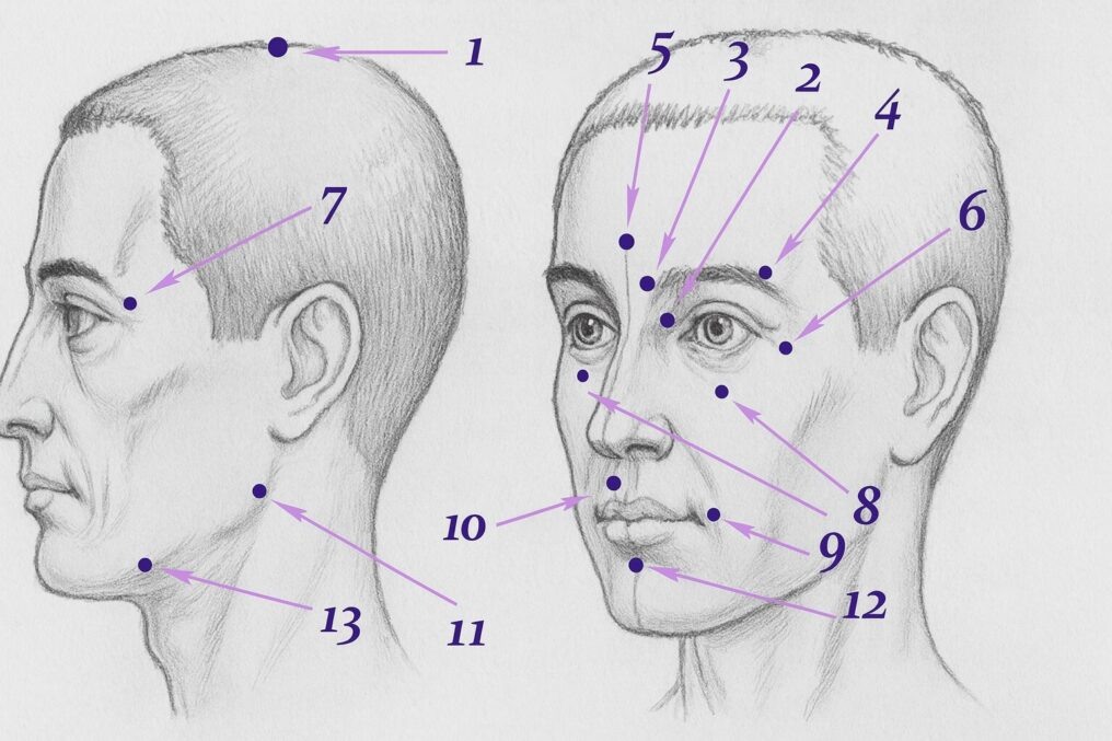 Как найти: положите указательный палец на внешний конец брови, средний — на верхушку уха. Точка находится посередине между ними в небольшом углублении.
