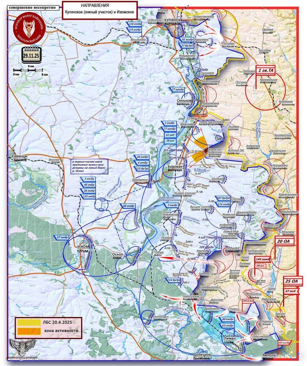 Карта боевых действий между Купянском и Красным Лиманом на 29.11.2025. Наши начали наступательные действия на северном фасе Боровского выступа.