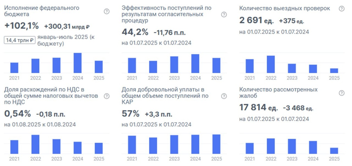 #НДС #налоги #бюджет #статистика Немного аналитики ранним утром в понедельник! Я обратил внимание на динамику снижения выездных проверок и жалоб. Что не означает рост это показателя в 2026 году. В росте исполнение ФБ по данным на июль 2025 года + 102,1 %. Интересная статистика.