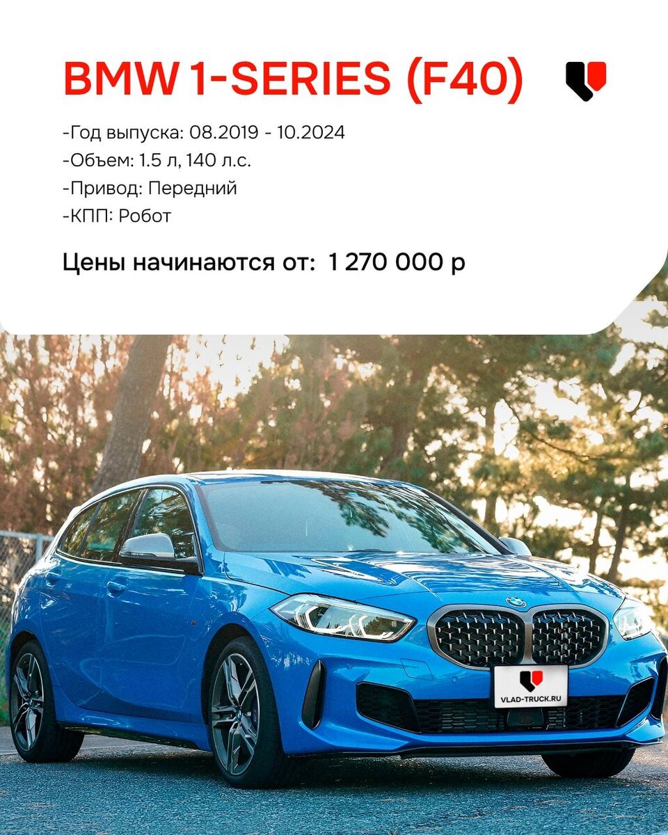 BMW 1-Series (F40) -Год выпуска: 08.2019 - 10.2024 -Объем: 1.5 л, 140 л.с. -Привод: Передний -КПП: Робот Цены начинаются от: 1.270.000р BMW 2-Series (F44) -Год выпуска: 10.2019 - 02.2025 -Объем: 1.5 л, 140 л.с. -Привод: Передний -КПП: робот Цены начинаются от: 1 600 000р BMW 2-Series Active Tourer -Год выпуска: 06.2018 - 05.2022 -Объем: 1.5 л, 140 л.с. -Привод: Передний -КПП: Робот Цены начинаются от: 1 370 000р BMW 2-Series Gran Tourer (F46) -Год выпуска: 06.2018 - 12.2022 -Объем: 1.5 л, 116/140 л.с -Привод: Передний -КПП: АКПП, МКПП Цены начинаются от: 1 420 000р BMW 3-Series (G20) -Год выпуска: 10.2018 - 08.2022 -Объем: 2.0 л, 156 л.с -Привод: Задний -КПП: АКПП, Цены начинаются от: 2 290 000р BMW X1 (F48) -Год выпуска: 10.2019 - 01.2023 -Объем: 1.5 л, 140 л.с -Привод: Передний -КПП: Робот Цены начинаются от: 1 835 000р BMW X2 -Год выпуска: 04.2018 - 10.2023 -Объем: 1.5 л, 140 л.с -Привод: Передний -КПП: Робот Цены начинаются от: 1 450 000р