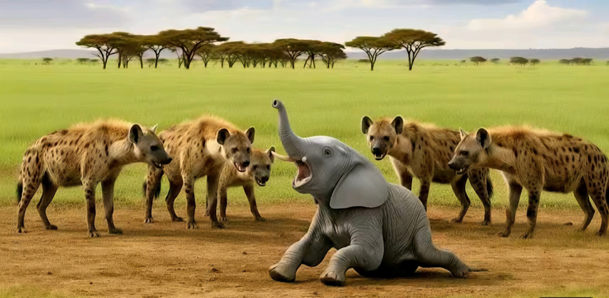 Саванна замерла в знойном мареве. Воздух дрожал от жары, но тревожную тишину разрывал отчаянный, пронзительный крик. Крошечный слонёнок, оставшийся без защиты стада, метался по кругу, зажатый в смертельное кольцо из шести гиен.