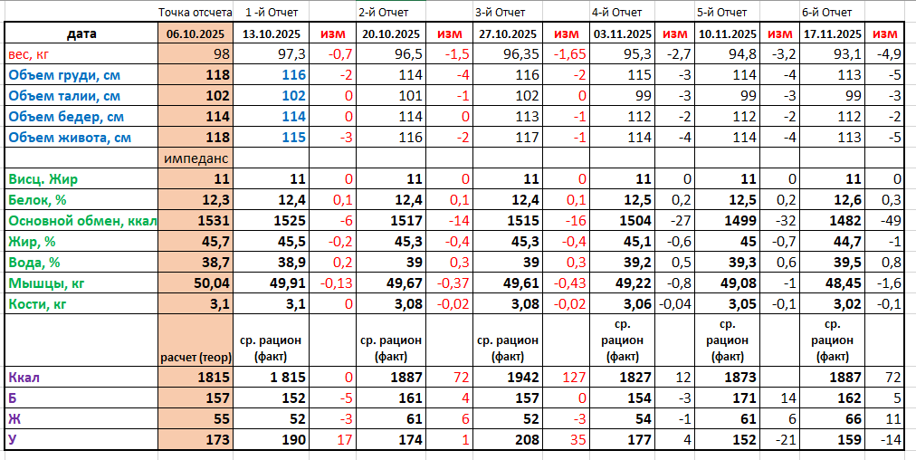 → возврат к стабильной динамике после остановки на 7-й неделе. Объёмы (см): Питание (среднее за неделю): Активность: Импеданс: Итог: