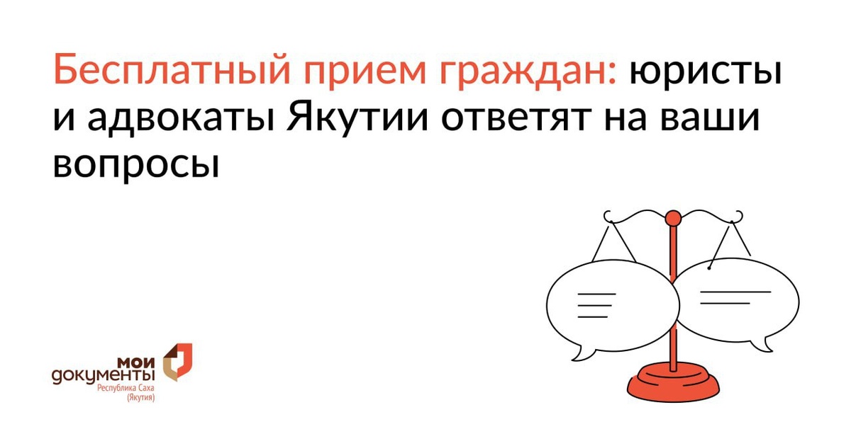 Друзья, приглашаем на уникальную правовую акцию 🔥 1 декабря 2025 года в офисе центра «Мои Документы» г. Якутска, ул. Аммосова, 18, в рамках V Съезда юристов РС(Я), состоится бесплатный прием граждан по гражданским делам с участием представителей Адвокатской палаты Республики Саха (Якутия) и Якутского регионального отделения «Ассоциация юристов России» 💬 💻Дата: 1 декабря 2025 года 🕓Время: с 14:00 до 18:00 часов 📍Место проведения: г. Якутск, ул. Аммосова, 18 Консультации предоставляются по вопросам: ✔️жилищного права, ✔️семейного законодательства, ✔️трудовых споров, ✔️земельных отношений, ✔️гражданского права и другим актуальным темам. Прием будет вестись в порядке живой очереди. Приглашаем всех желающих!❤️