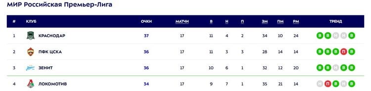 На первом месте сейчас расположился действующий чемпион, «Краснодар». У команды Мурада Мусаева – 37 очков. Вторым идет ЦСКА – подопечные Фабио Челестини набрали 36 очков. Столько же и у идущего третьим «Зенита», но у армейцев есть преимущество за счет бОльшего числа побед в лиге (11 против 10 у сине-бело-голубых).