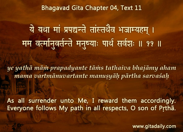 «Как все предаются Мне, так Я и вознаграждаю их. Все следуют Моему пути, о сын Притхи».