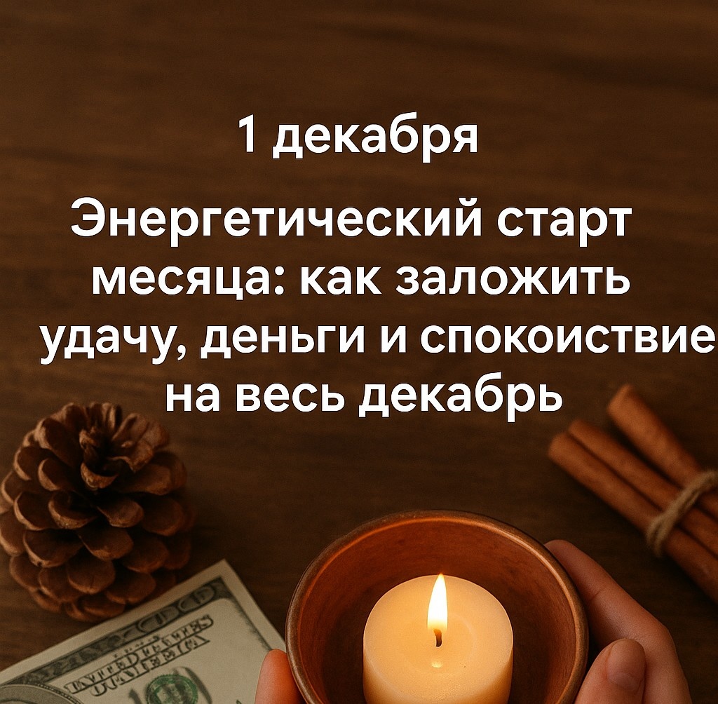 1 декабря — это не просто начало календарного месяца. С энергетической точки зрения первый день декабря задаёт ритм и настроение всем последующим неделям. Это как первая нота в музыке — именно она определяет, каким будет весь мотив. Поэтому сегодня особенно важно, с какими мыслями, ощущениями и решениями вы входите в декабрь. Энергия дня мягкая, спокойная, слегка замедленная. Это не про резкие рывки и давление, а про настройку себя на новый этап. Сегодня хорошо: Именно с таких небольших внутренних решений начинается глубокое обновление — тот самый путь, который мы стартуем сегодня в рамках моего магического Адвента. 1 декабря идеально подходит для: Даже одно спокойное и осознанное действие сегодня усиливается и растёт весь месяц. Чтобы не закладывать напряжённый фон на декабрь, желательно избегать: Сегодня всё, что вы делаете через силу, может тянуться тяжёлым фоном дальше. День нейтральный, но очень показательный для финансовой темы. Хорошо: Не лучшая идея — импульсивные траты