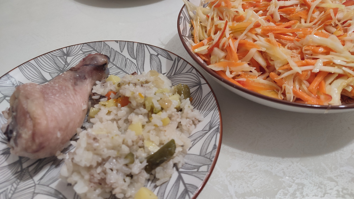 Всем приветик, мои дорогие 🤗. Отгуляла я свой отпуск. На декабрь постаралась взять больше заявок. Буду работать примерно 4 раза в неделю, до 16 декабря точно. Но и после, было бы неплохо не профукать. Муж сказал, что вообще теперь в отпуск ходить не будет 😁🤦♀️. Ну да, этой осенью было тяжеловато с деньгами. Один только логопед чего стоит. Ну ничего, скоро всё образуется 🙏. Итак, работаю я сегодня всего лишь 4 часа, 9-13. Но кроме работы будет много других дел. Это поход в магазин, логопед, и конечно же готовка. Вчера впервые готовили курочку в духовке с рисом и овощами. На дно формы выложила замороженные овощи. Сверху насыпала рис, и уже потом голени и бёдра. Посолила, добавила немного воды. Фольгой не накрывала. Готовила примерно 1 час 15 минут. Не пойму, что с духовкой, но ничего не подгорело. А аромат какой... Ммм... 😍 Как же без салата? Салат сегодня и завтра будет витаминный. Здесь нам нужно немного капусты, болгарский перчик, морковь, и если хотите, можете добавить и