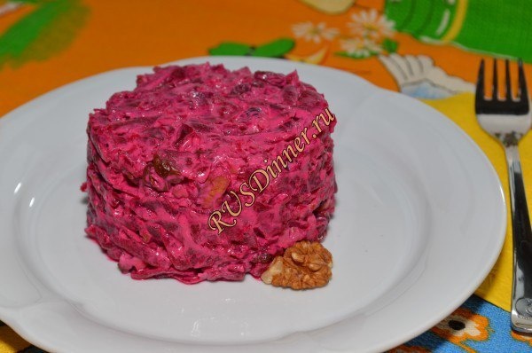 Салат из свеклы с орехами и изюмом От автора: Салат из свеклы с орехами и изюмом получается сладковатым за счет свеклы и изюма, и очень сытным за счет орехов. Ингредиенты: Свекла - 400 гр. Орехи грецкие - 80 гр. Изюм - 80 гр. Сметана - 50 мл. (2 ст. л.) Источник: https://rusdinner.ru/page/salat-iz-svekly-s-orehami-i-izjumom