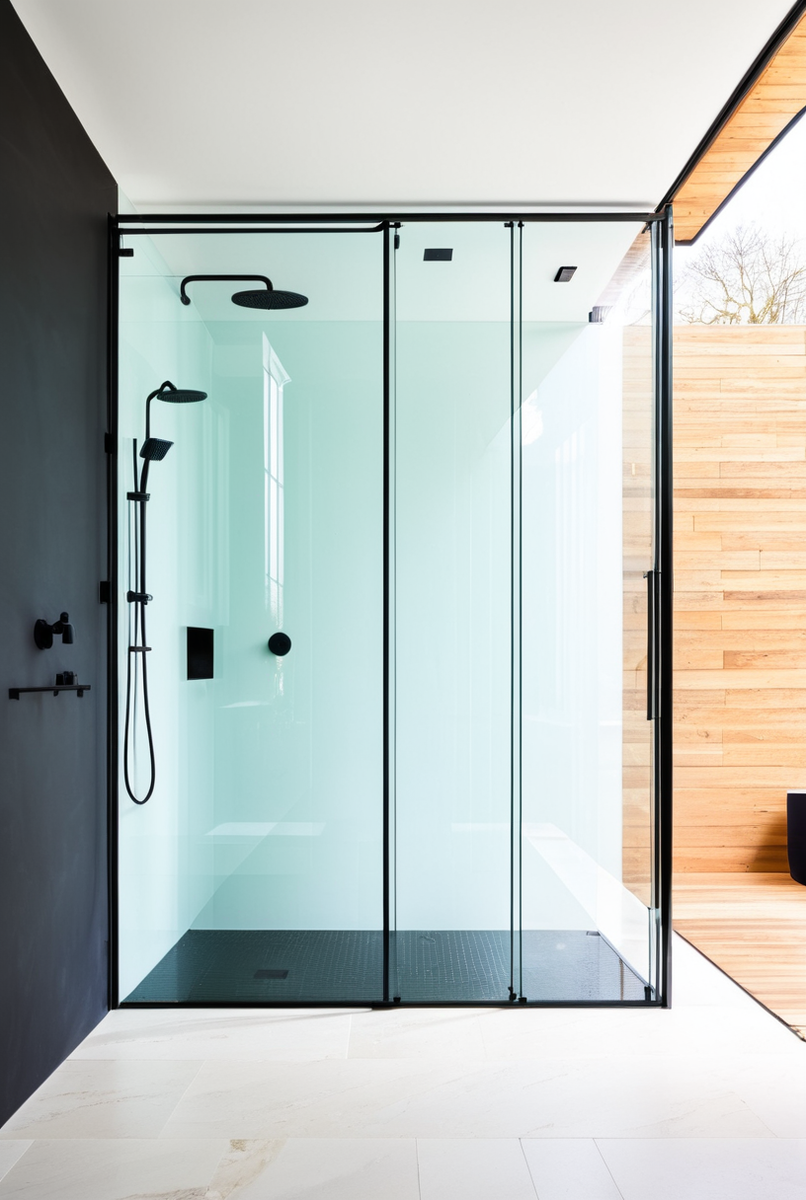 Матовое стекло (сатинированное) обеспечивает конфиденциальность и скрывает следы от воды, упрощая уход. - Триплекс: Два слоя стекла с полимерной пленкой между ними. Самый безопасный материал: осколки остаются на пленке. Триплекс — премиальное и дорогое решение.