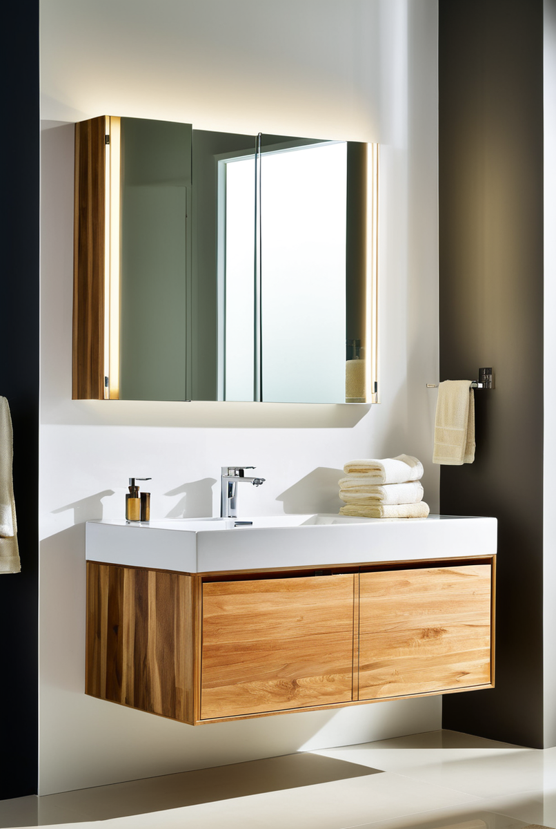 Широкий шкаф (от 80 см) идеален для просторных комнат, часто устанавливается над большой столешницей и предлагает максимум места для хранения. - Высота: Высота подбирается с учетом роста пользователей и высоты потолков. Зеркало должно располагаться на уровне глаз; Стандартно нижний край шкафа монтируют на 15-20 см выше смесителя.