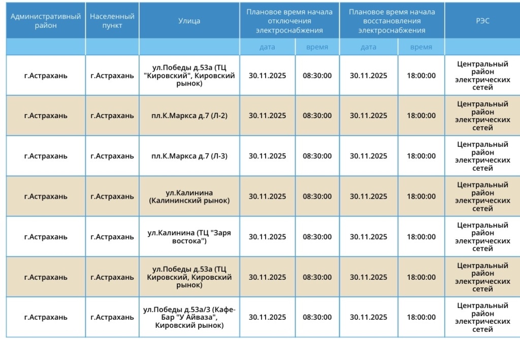 30 ноября астраханские рынки и ТЦ останутся без света