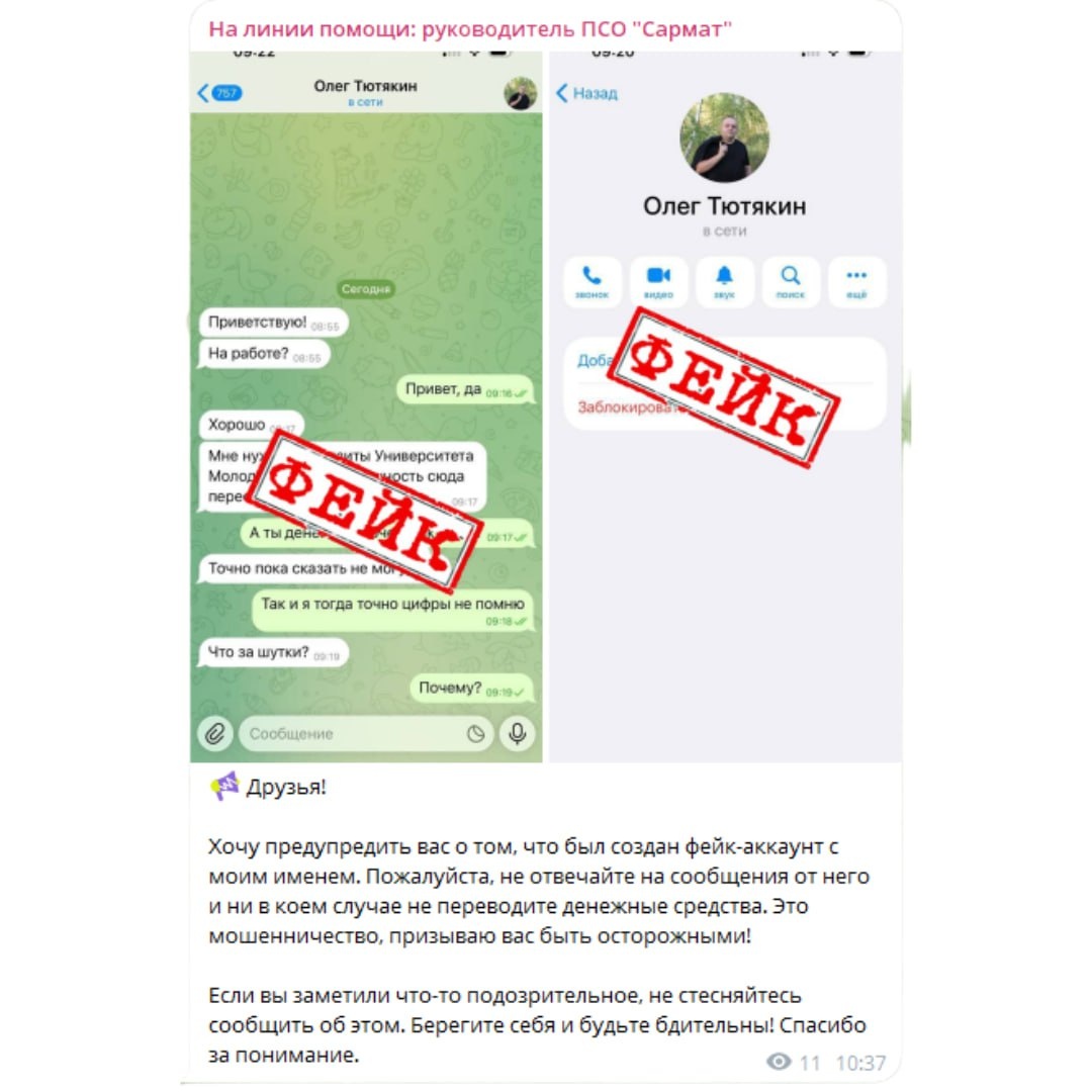 📢📣📣📣📣📣 Начальник ПСО "Сармат" сообщил о том, что был создан фейк-аккаунт с его данными. Информация доступна на официальном канале: https://t.me/tyutyakinoleg/261. Просим вас быть бдительными и не реагировать на сообщения от подозрительных аккаунтов. Берегите себя и свои данные! Официальные страницы и аккаунты начальника ПСО "Сармат": ✅Официальные каналы: https://max.ru/id5751061510_biz https://t.me/tyutyakinoleg https://sarmat.gosuslugi.ru/nachalnik/ ✅Официальные аккаунты: https://t.me/Otyutyakin https://vk.com/o.tyutyakin #Безопасность #Мошенничество #ФейкАккаунт