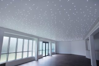 Представьте сотни тончайших светодиодов — как волосы ангела. Один источник света, а каждая «волосинка» заканчивается точкой на потолке. Эти точки можно расположить как угодно: повторить реальные созвездия, создать абстрактный узор или даже написать инициалы. Когда система включается, создаётся эффект объёма и бесконечной глубины. Вариант 2: Светодиодное сияние