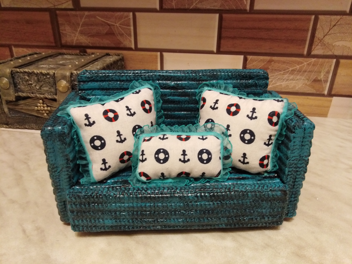 Подушечки на диванчике - для иголок и булавок, я их дополнительно украсила капроновой тесьмой. А в выдвижном ящичке можно хранить сантиметровую ленту, напёрстки, ножницы, шпульки с нитками. бусины, пайетки. В общем, многое из того, что может пригодиться в шитье. Вначале я склеила между собой спичечные коробки, потом получившиеся формы обклеила картоном. Чтобы придать дополнительную крепость конструкции, обклеила ещё салфетками. Далее собрала воедино все элементы на полимерный клей и обклеила фрагментами из не скользящего коврика. Выдвижной ящичек склеила из картона. Здесь тоже для укрепления конструкции салфетки были мне в помощь. Ну, а дальше покраска, лак. Сшила их льняной ткани подушечки, украсила из капроновой тесьмой и приклеила на сиденье