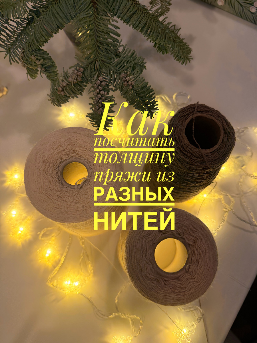 У меня новый проект в котором я вяжу из смеси пряж трех разных толщин. 1 нить бежевый меринос 1500/100 2 нить молочный меринос 1350/100 3 нить коричневый хлопок с па 750/100. Перед началом вязания мне нужно посчитать какая же итоговая толщина у получившийся смеси. Я использую такой метод: Считаю сколько метров в 1 грамм каждой пряжи У меня новый проект в котором я вяжу из смеси пряж трех разных толщин. 1 нить бежевый меринос 1500/100 2 нить молочный меринос 1350/100 3 нить коричневый хлопок с па 750/100. Перед началом вязания мне нужно посчитать какая же итоговая толщина у получившийся смеси. Я использую такой метод: Считаю сколько метров в 1 грамм каждой пряжи 1 нить 100/1500=0,0667 2 нить 100/1350=0,0741 3 нить 100/750=0,133 Складываю получившийся метры 0,0667+0,0741+0,133=0,274 И нахожу сколько метров в 1 грамме по отношению к 100 метрам 100/0,274=364,964 Результат: смесь моей пряжи имеет толщину 365 грамм в 100 метрах. А какими способами считаете вы? 1 нить 1