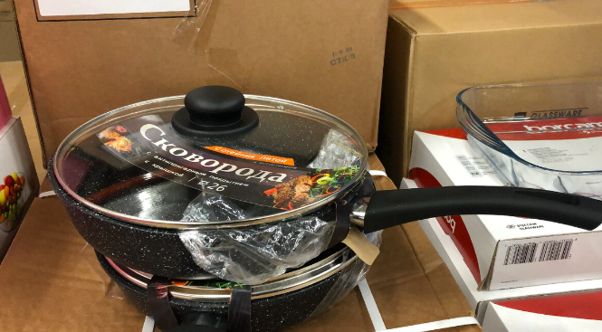 Для жарки привезли литую алюминиевую сковороду с антипригарным покрытием. Диаметр 20 см, крышка в комплект не входит. Изготовитель — Россия, город Белгород. Цена 699 рублей.