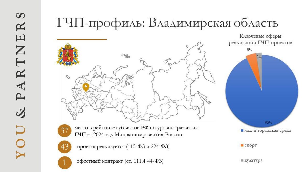 🏆 Место в рейтинге - 37 Согласно итоговой оценке рейтинга субъектов РФ по уровню развития ГЧП за 2024 год (Минэкономразвития России), Владимирская область занимает 37 место, поднявшись на 7 позиций по сравнению с 2023 годом). 🧮 Количество проектов По данным РОСИНФРА в регионе реализуется 43 ГЧП-проекта (учтены проекты по 115-ФЗ и 224-ФЗ на стадиях от предынвестиционного этапа до завершения проекта). 🧩 Сферы реализации проектов: - ЖКХ и городская среда (40 проектов); - культура и досуг (1 проект); - спорт (2 проекта). Примеры проектов: 🎡 Концессионное соглашение в отношении здания кинотеатра «Художественный» МО г. Владимир (КС заключено 26.03.2019 на 49 лет, объем инвестиций 104,5 млн. руб.). 📑Офсетные контракты в регионе: 1 шт. По данным zakupki.gov.ru в регионе реализуется 1 офсетный контракт. 🛑 Контракт на поставку стабилизирующей добавки для щебеночно-мастичных асфальтобетонов. 🔍Основные характеристики региона по данным Росстата: - численность постоянного населения 1 297 93
