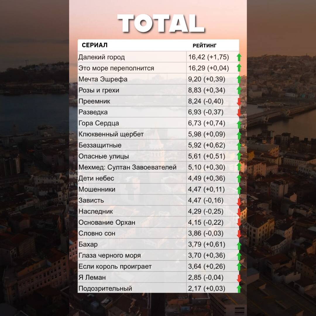 Сериал «Далекий город» вновь возвращает себе первое место в категории Total, однако его преимущество над ближайшим конкурентом «Это море переполнится» остается минимальным. Фактически речь идет о равной борьбе, где любое колебание зрительского интереса может изменить расстановку сил.