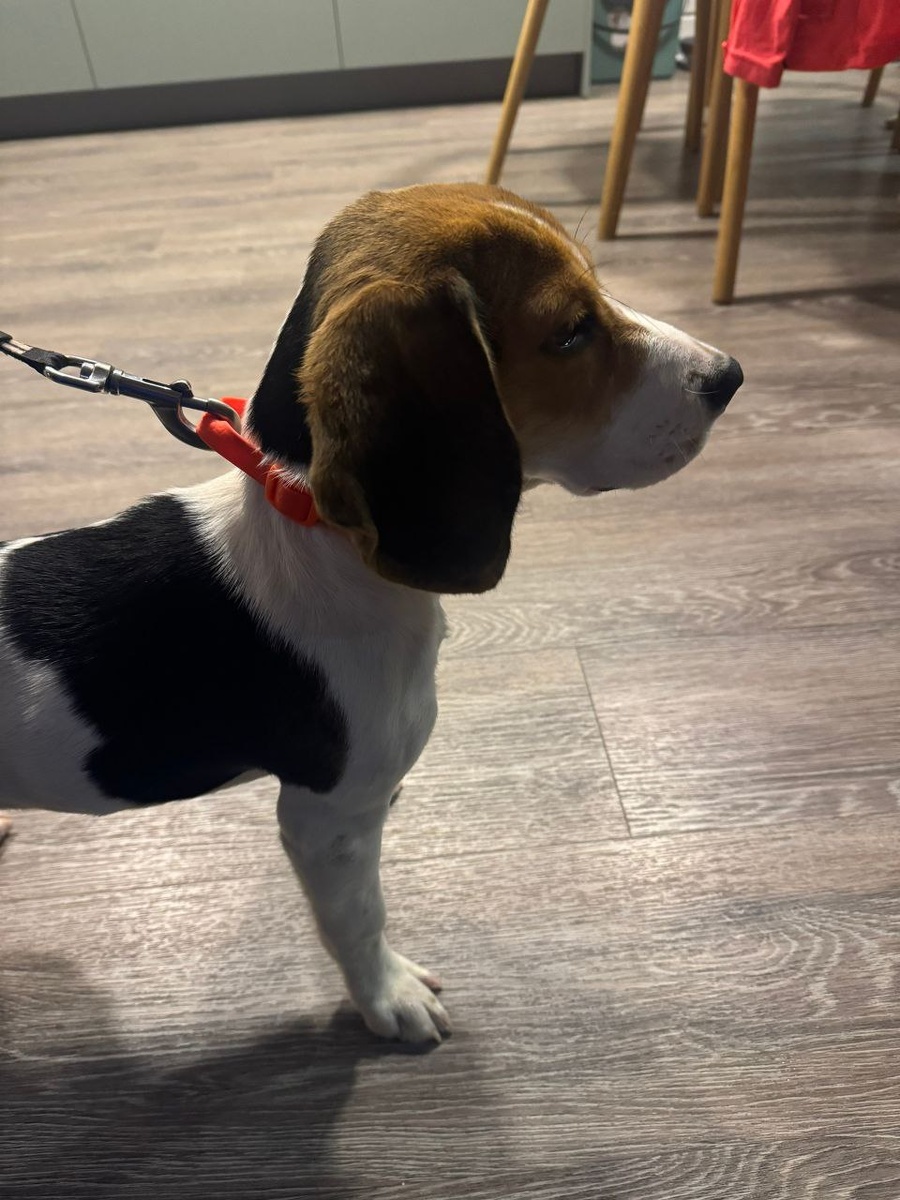 Найден щенок бигля. Ошейник оранжевый. Был в подгузнике.