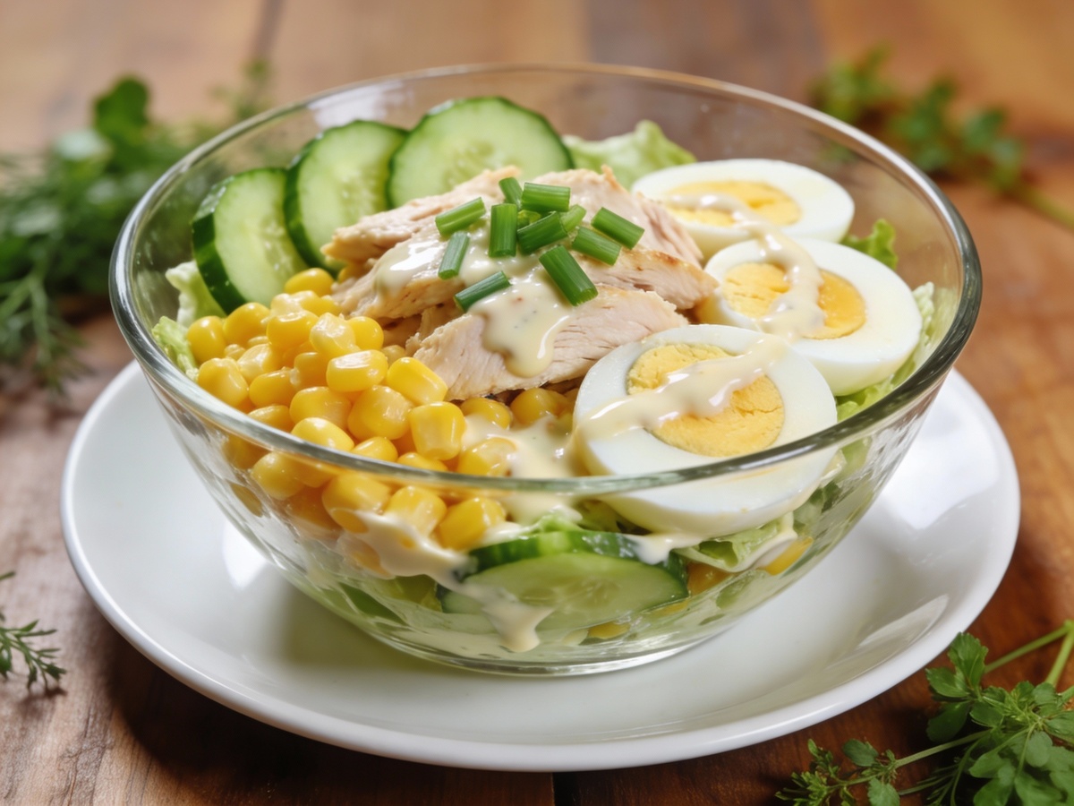 Салат с курицей и кукурузой — это один из самых универсальных салатов русской кухни, который готовится за 15–20 минут и подходит на любой случай. Нежное отварное куриное мясо, сладкая консервированная кукуруза, хрустящий свежий огурец, варёные яйца и простая майонезная заправка создают идеальный баланс вкусов и текстур. Идеален как на обычный ужин, так и для праздничного стола.