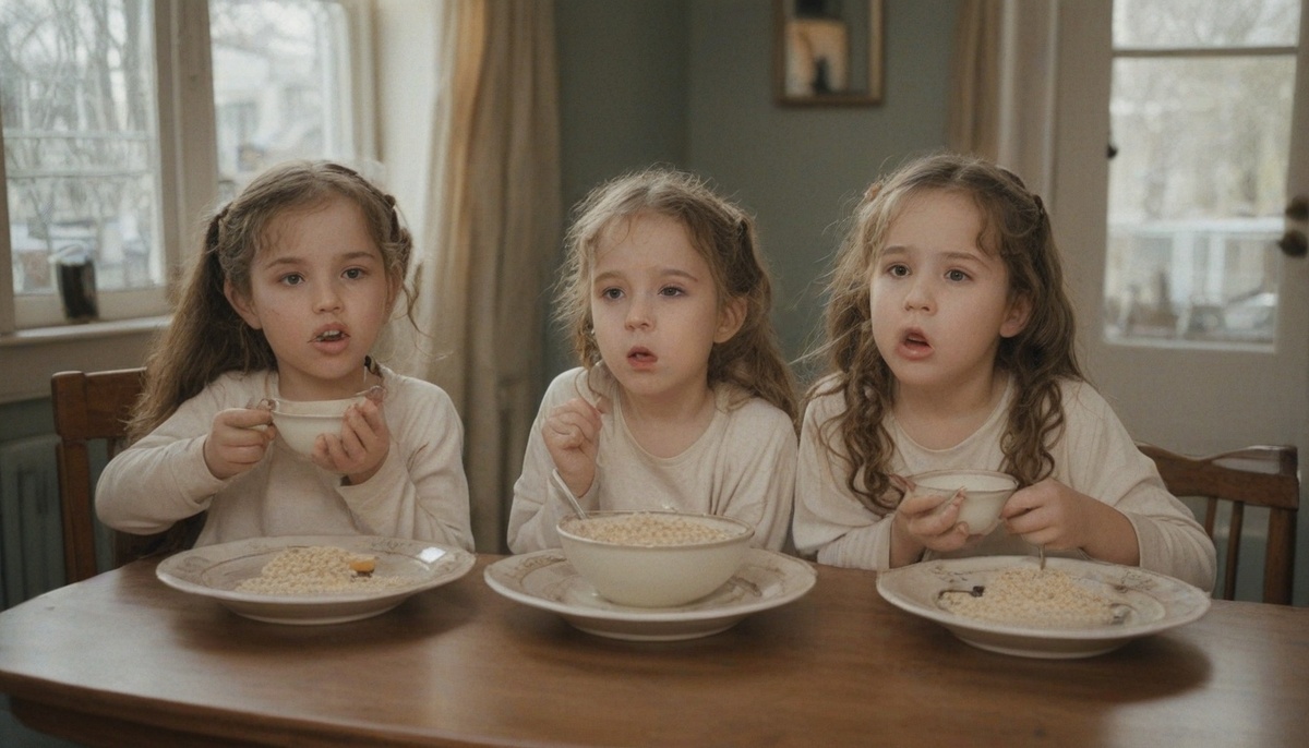 В тихой квартире, залитой утренним солнцем, две семилетние девочки-близняшки сидели за столом, поедая овсянку. Казалось бы, обычное утро, но между сестрами витала напряженность. Маша, с хитрыми искорками в глазах, вдруг заявила: