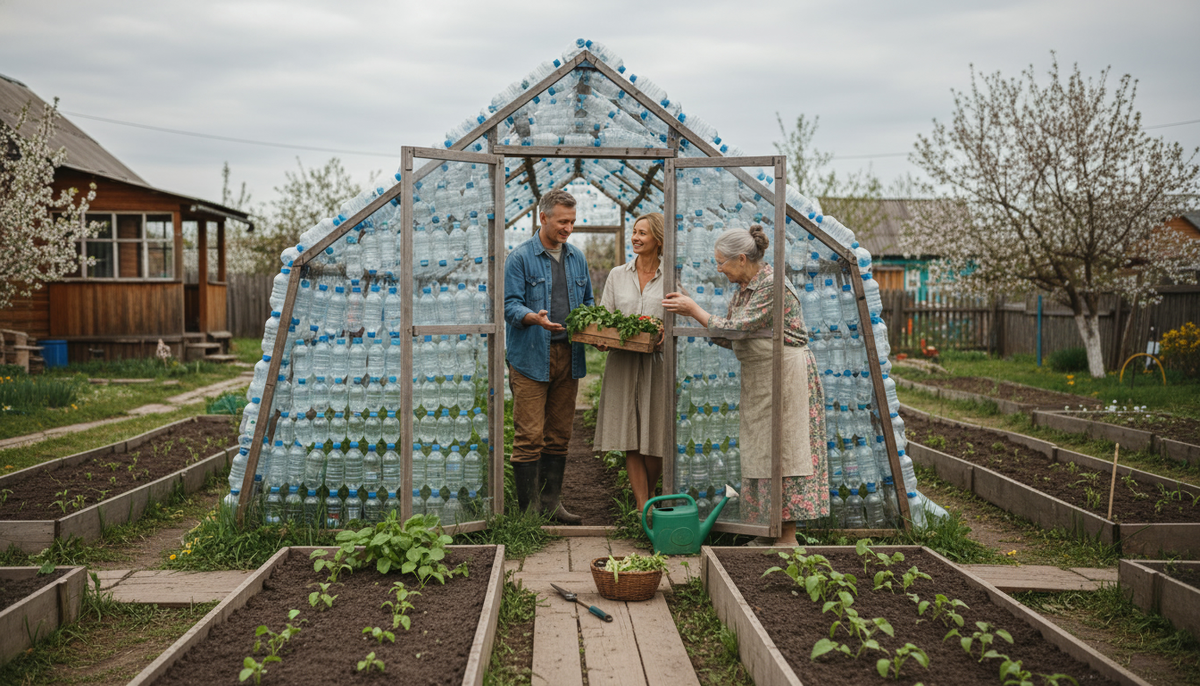 Пока в марте у нас на веранде шуршали пакеты с рассадой, я перебирал целую гору чистых полторашек. Запах лёгкого моющего, мокрые крышки раскладываются на полотенце, на подоконнике — термометр и рулетка. Мы давно обещали себе сделать бюджетную теплицу из пластиковых бутылок: и отходы в дело, и руки поработают. Заодно проверить на практике, где этот способ экономит, а где наоборот добавляет хлопот. В итоге у нас вышло две конструкции: одна полноценная на каркасе, вторая — серия мини-колпаков над ранней капустой и салатом из бутылки 5 литров. Расскажу, как шли, что учли, и почему в вопросе количества бутылок разные источники называют разные цифры.