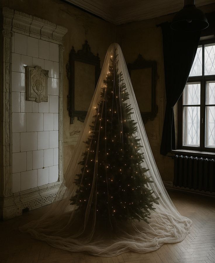 Добавить органзу в декор- легкий способ сделать вашу ёлочку загадочной и элегантной, а новогодний вечер готическим