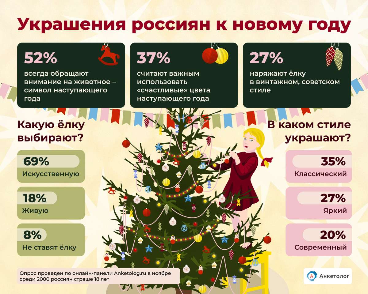 Опрос онлайн-панели Anketolog.ru среди 2000 россиян показал: новогоднее оформление остаётся важной частью подготовки к празднику, а уют (62%) и традиции (16%) — ключевые ориентиры в выборе декора. Ёлка: главный символ и элемент декора Для 70% опрошенных Новый год невозможен без ёлки. Семья и близкие важны для 62%, мандарины — для 56%, а снег — для 50%. Украшать ёлку в этом году планируют 78% респондентов: искусственную — 62%, живую — 16%. Не будут наряжать ёлку 12%. Стиль ёлочных украшений остаётся разнообразным. Эклектику с сочетанием разных цветов и стилей предпочитают 27%, «винтаж», советские игрушки и ностальгическую эстетику — 26%. Минимализм выбирают 20%, оформление в единой цветовой гамме — 16%. Подход к покупке новогодних украшений не меняется: 53% используют украшения годами, лишь частично обновляя набор. Ежегодно покупают новые элементы 20%, а 36% приобретают игрушки каждый год или чаще. Украшения дома Помимо ёлки, почти все россияне украшают дом дополнительным декором. Ин