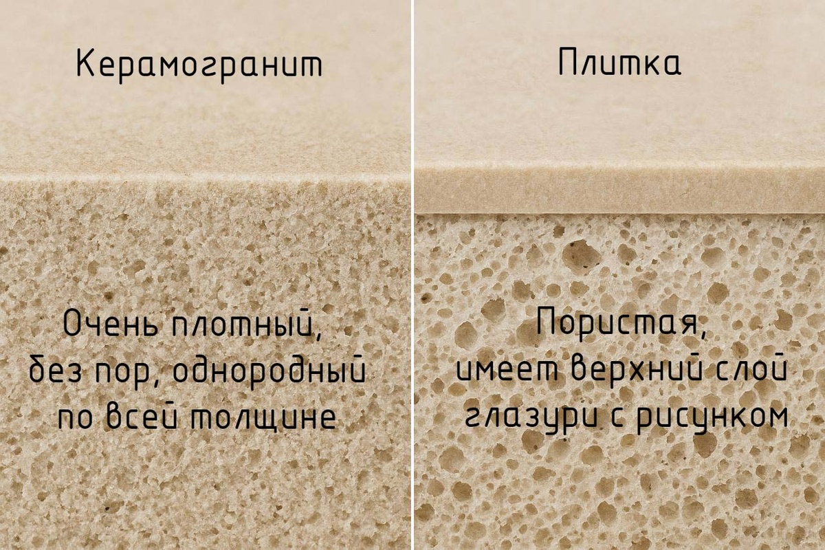 Керамическая плитка и керамогранит — это не одно и то же, и выбор между ними определяет долговечность и внешний вид вашего ремонта. Главное отличие кроется в составе и технологии производства. Керамическая плитка (кафель), создается из обожженной глины и обладает пористой структурой. Керамогранит — это более совершенный материал: его прессуют под огромным давлением и обжигают при экстремально высоких температурах, что делает его монолитным и сверхплотным. Керамическая плитка Из-за этой разной «анатомии» вытекают ключевые практические отличия. Керамогранит практически не впитывает воду (водопоглощение менее 0,5%), что делает его идеальным для улицы, влажных помещений и систем «теплый пол». Он невероятно прочен и износостоек. Обычная плитка более уязвима к ударам и влаге, хотя для стен в ванной или кухонного фартука качественный глазурованный кафель — отличный и более бюджетный вариант. Керамогранит Дизайн — еще один важный аспект. Керамическая плитка часто предлагает богатство глянцев