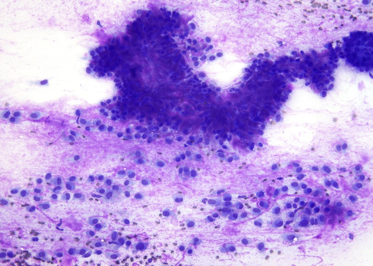 Классическая картина плеоморфной аденомы слюнной железы При качественном окрашивании по Романовскому-Гимзе миоэпителиальные клетки всегда ярко выделяются на фоне зернистой стромы. #слюннаяжелеза #цитология