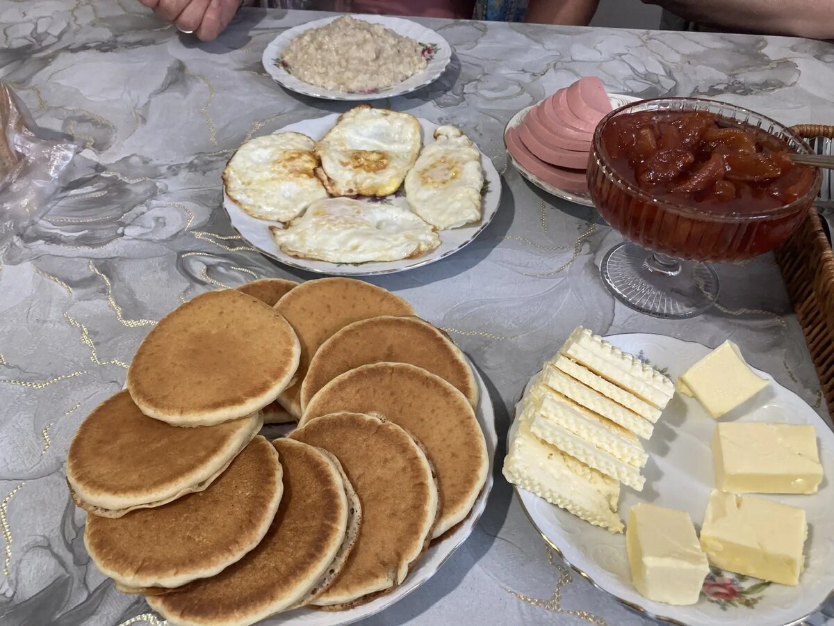 Завтрак, ребят. Каша (Ура!!! Каша!), сыр, масло, колбаса, персональная яичница, оладьи, варенье. Чай был. Чай не сфотографировала.