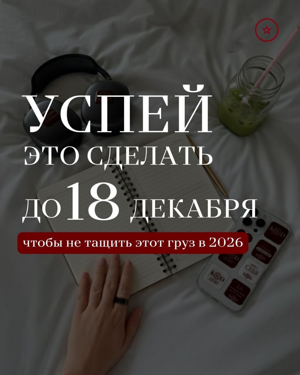 УСПЕЙ ЭТО СДЕЛАТЬ ДО 18 ДЕКАБРЯ 🖇️2025 год — год завершений под цифрой 9⃣ 📎Декабрь — самый сильный месяц, когда мы и так завершаем цикл, и нам дается последний шанс отдать все долги и учесть все уроки уходящего года. ‼️Это важно сделать до 18 декабря, пока не закроется энергетический цикл. 📎Непройденные уроки и незакрытые долги перейдут в 2⃣0⃣2⃣6⃣и их давление кратно усилится. ▫️Если ты хочешь отпустить уроки прошлого и войти в 2026 полностью открытой новому: ✅ Заверши старые проекты и начатые дела.✅ Простите тех, кого держишь в сердце обидой. ✅ Избавься от всего ненужного, физического и эмоционального груза. ✅ Подведи итоги и осознайте свои достижения и успехи. ✅ Осознай и запиши главные жизненные уроки уходящего года. ✅ Отпусти страх перед будущим и поверь в новые возможности. ✅ Вырази благодарность себе и окружающим за пройденный путь. 🖇️2026 принесет удачу каждому, кто подготовился к нему и новому началу правильно — открой свое сердце новым возможностям и энергии нового ци