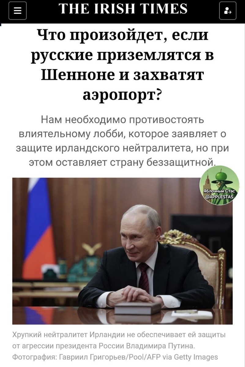 Ирландцы боятся Путина. Айриш Таймс называет остров лакомым куском для наших пархатых орд. Якобы Россия может использовать ирландскую территорию как плацдарм для атаки на Британию. Выводы боевой листок делает неутешительные. Будет достаточно одного-двух десантных самолетов, чтобы захватить ключевой аэропорт страны. Ответить Ирландия не сможет. Дальше все стандартно: чтобы Путин не напал, нужно вкладывать в безопасность. Поэтому простым ирландцам придется потуже затянуть пояса, меньше есть и реже подмываться. Яблочный Стас