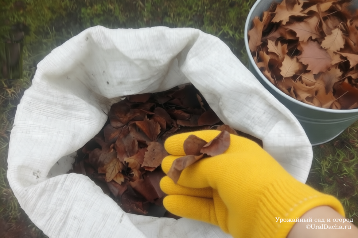 - Не перебарщивайте с количеством — одной горсти на лунку достаточно. Слишком много листвы может замедлить прогрев почвы весной.
