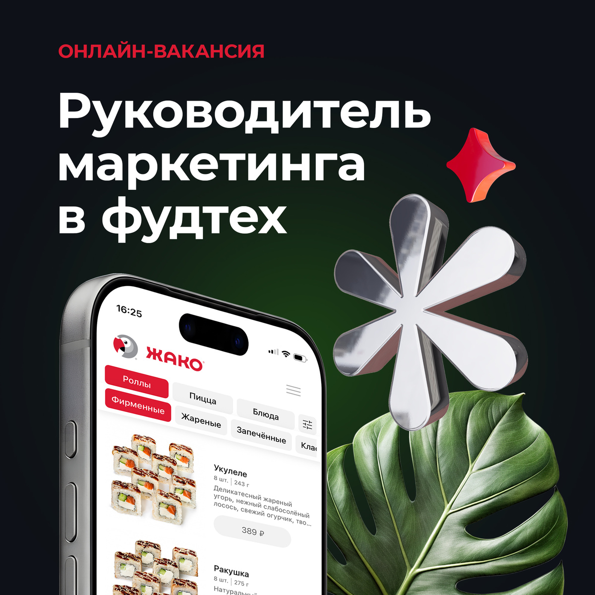 Открыта онлайн-вакансия руководителя маркетинга в фудтех-компании. Задача: построить маркетинг бренда, который готовится к масштабированию. Мы — «Жако», доставка роллов и пиццы.
