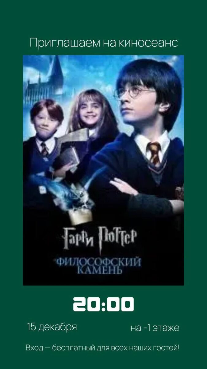 🎬 Кинозона апарт-отеля FREEDOM! ⚫️ -1 этаж 🕗 Начало сеансов в 20:00 🫰 Вход для гостей отеля БЕСПЛАТНО Каждый вечер мы создаем для вас особую атмосферу, где можно отдохнуть и погрузиться в мир захватывающих историй. Приготовьте попкорн и устраивайтесь поудобнее! Расписание на неделю: ⚡ ПОНЕДЕЛЬНИК: «Гарри Поттер и Философский камень» (6+) Жанр: фэнтези, приключения, семейный фильм 🏴☠️ ВТОРНИК: «Пираты Карибского моря: Проклятие Черной жемчужины» (12+) Жанр: фэнтези, приключения, комедия 🕊️ СРЕДА: «Зеленая миля» (16+) Жанр: драма, фэнтези 🏃 ЧЕТВЕРГ: «Форрест Гамп» (16+) Жанр: драма, мелодрама, комедия 🚀 ПЯТНИЦА: «Интерстеллар» (12+) Жанр: фантастика, драма, приключения 🎷 СУББОТА: «Душа» (6+) Жанр: мультфильм, фэнтези, приключения ❤️ ВОСКРЕСЕНЬЕ: «1+1» (16+) Жанр: драма, комедия --- А какой фильм из этой недели вы бы хотели посмотреть, когда приедете к нам в гости? Поделитесь в комментариях — мы будем рады подготовить для вас самый уютный киновечер! 🍿 #афишаFreedom